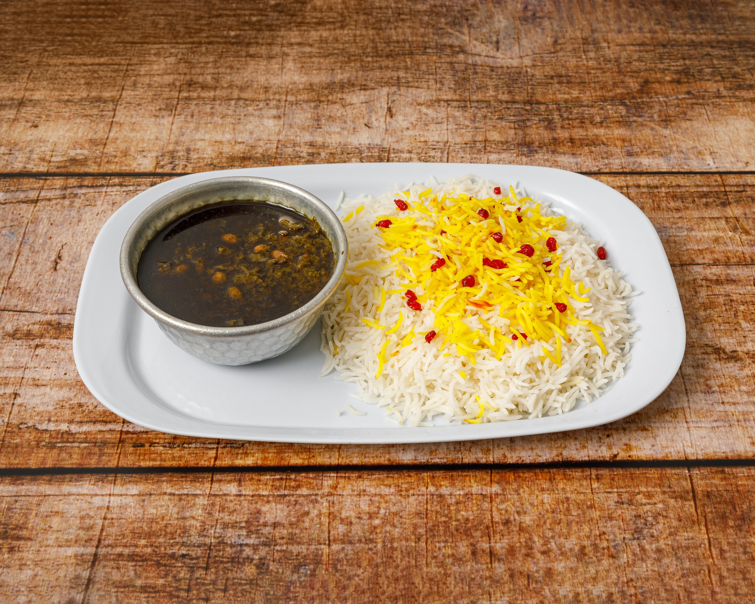 Traditionelle Saucengerichte wie Ghormeh Sabzi oder Khoresh Gheimeh ergänzen die Grillkarte.